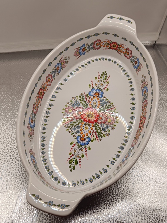 Naczynie żaroodporne na podeście drewnianym, można w nim piec zapiekanki, mięso itd.